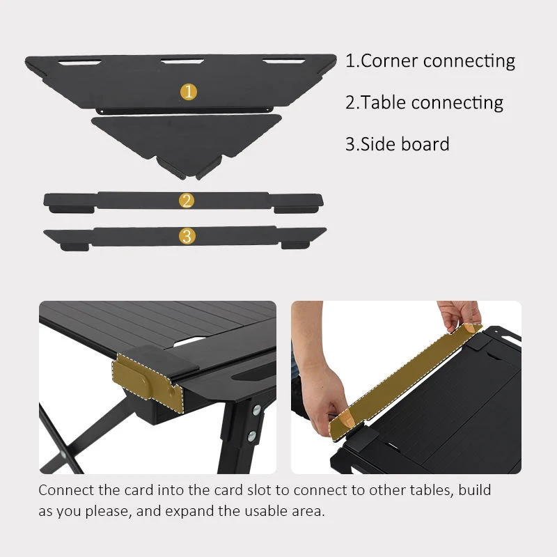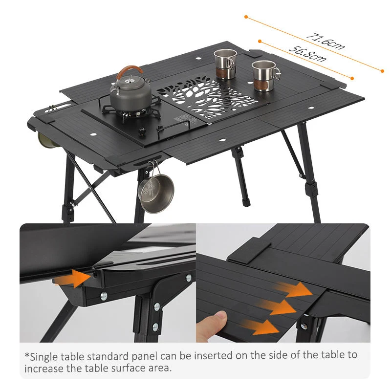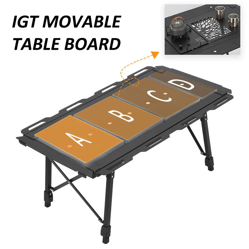 Taula de càmping a l'aire lliure plegable d'alumini, tant si exploreu un terreny de muntanya accidentats com si gaudiu d'un pícnic en camps herbosos plans, aquesta taula de càmping gestiona sense esforç diversos reptes, proporcionant un suport estable i fiable per a activitats a l'aire lliure.