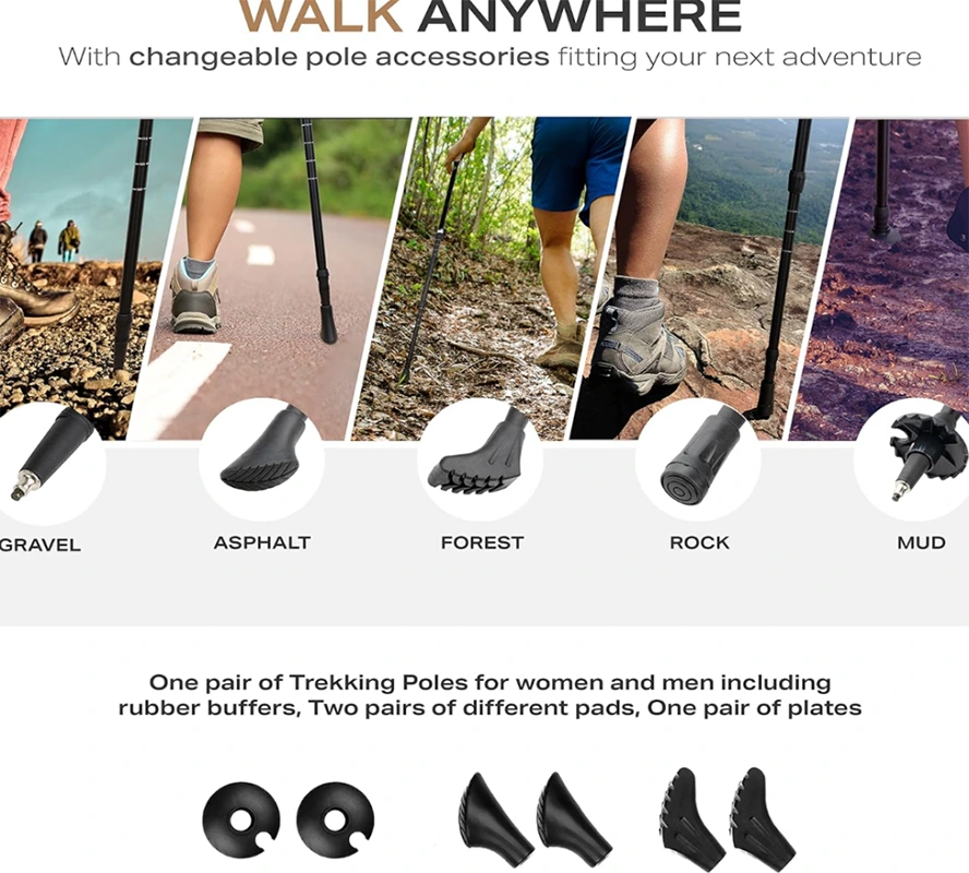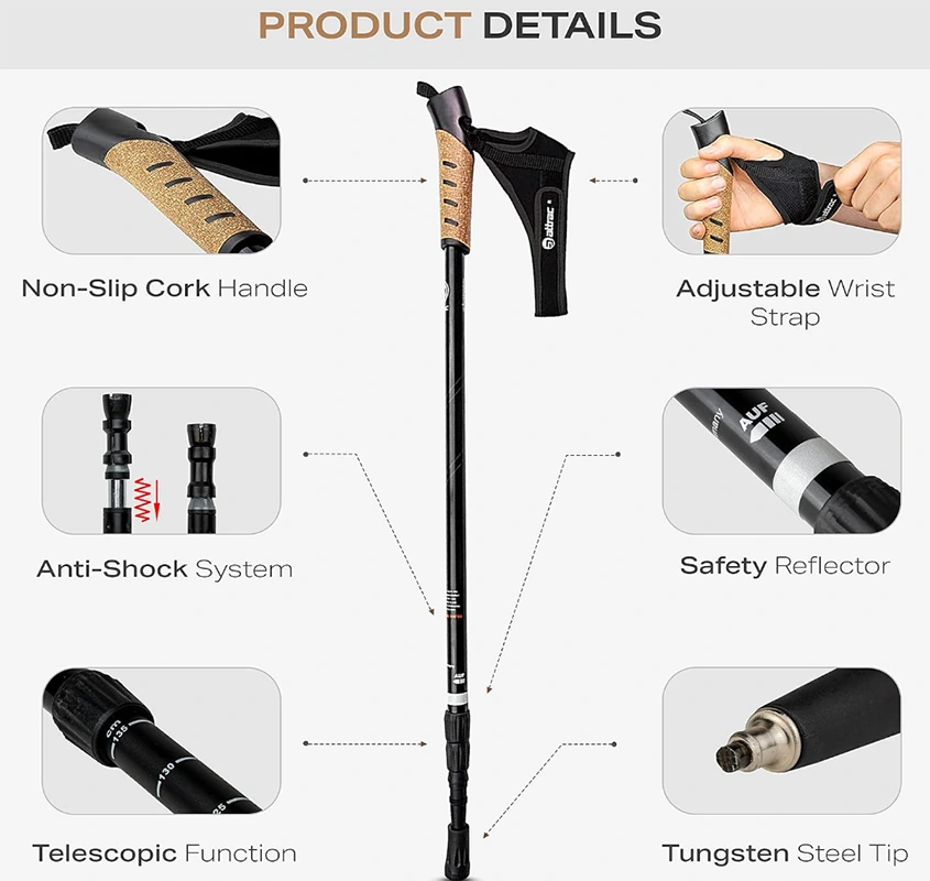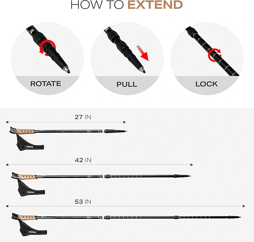 Bastons de senderisme Bastons de senderisme. Bastons de senderisme ajustables, de 53" de llarg quan s'estenen i de 27" quan estan plegats. Gràcies a la fixació ràpida de gir, els bastons de senderisme són fàcils d'ajustar a la vostra alçada i pes. Això fa que siguin els bastons de senderisme plegables perfectes per a dones i homes.Zhejiang Jiayu Outdoor Products Co., Ltd., Els nostres bastons per caminar per a gent gran que els entusiasme mantenir-se actius i explorar a l'aire lliure.