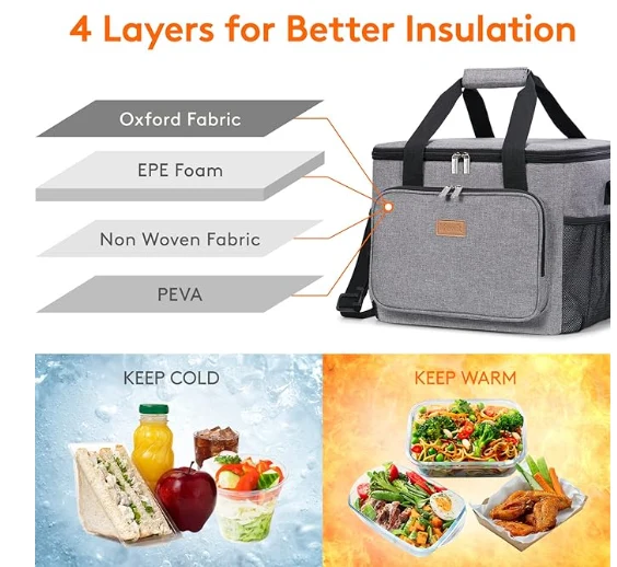 La bossa de pícnic aïllada, la bossa de dinar està feta de material aïllat que pot mantenir el menjar i les begudes fresques o calentes durant més de 5 hores. A més, el revestiment interior està fabricat amb paper PEVA de grau alimentari, de manera que podeu posar el menjar a la bossa directament sense cap problema. L’escuma EPE integrada de 6 mm proporciona una gran protecció als vostres contenidors, menjar i begudes.