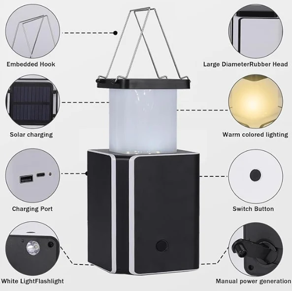 Llum de càmping solar LED. El xip de lumens alts de LED recarregable SMD2835 High Lumens. A més, hi ha un mànec al cos de la làmpada, podeu subjectar -lo o penjar -lo a qualsevol lloc que necessiteu, molt convenient