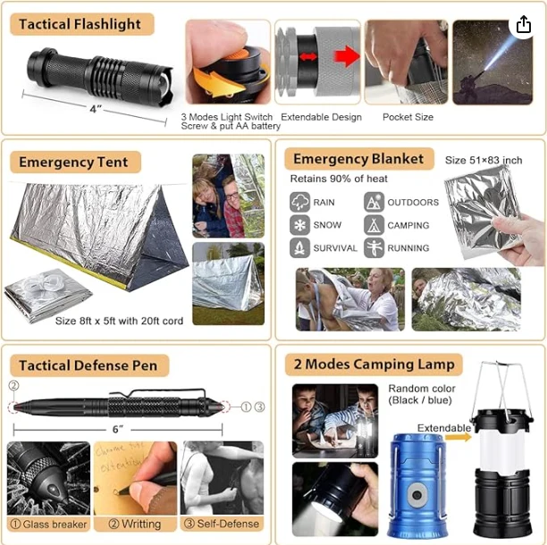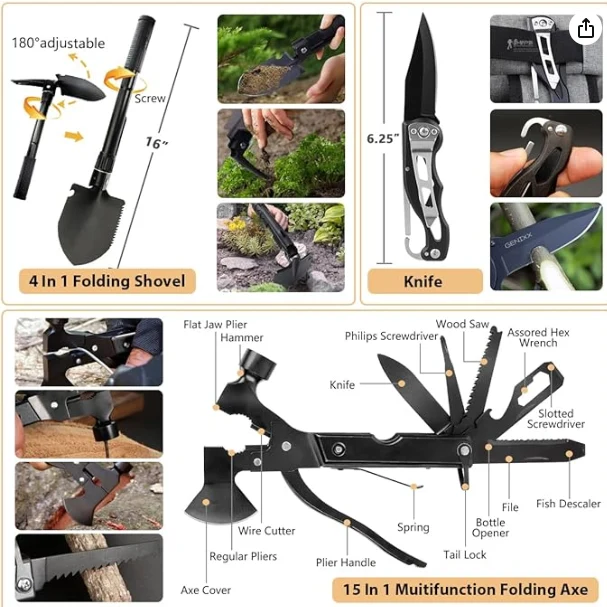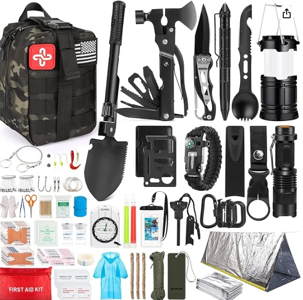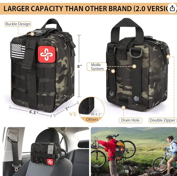 La bossa de primers auxilis de Molle Inclou un total de 250pcs eines de supervivència polivalents. Conté l’engranatge i les eines de supervivència més populars, també un kit de primers auxilis que suficient per tractar una família o un grup d’amics en circumstàncies d’emergència.