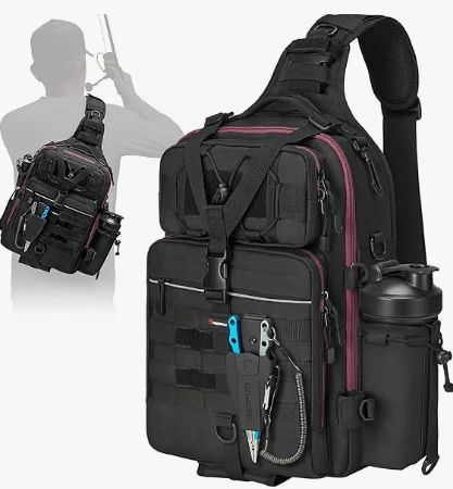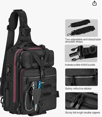 Les corretges d’espatlles desmuntables faciliten l’ús d’aquesta bossa com a bossa d’espatlla, motxilla, bossa de mà, bossa de pit, bossa de pesca o bossa de viatge. Amb dos cinturons de varetes per subjectar les varetes, la longitud principal de la corretja es pot estendre fins a 51,2 '', mentre que la corretja associada es pot estendre a 36,2 ''