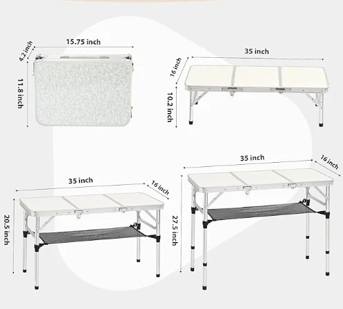 Taula de plegament de 3 peus: amb dimensions de mida completa de 35 polzades x16 polzades x 27,5 polzades i dimensions plegades de 16 polzades x 12 polzades x 4,2 polzades