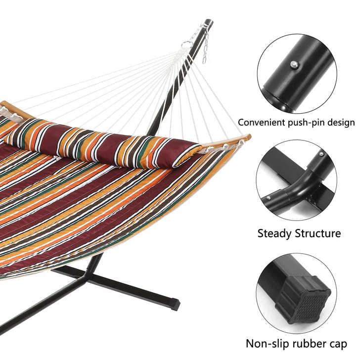 El conjunt de hamaca portàtil de nylon d'aquesta hamaca és molt senzill, no calen eines. Un cop muntat el suport, la hamaca es pot penjar directament al ganxo del suport i també es pot desmuntar fàcilment.