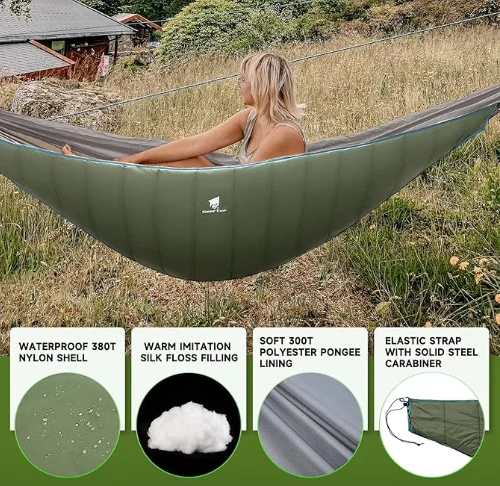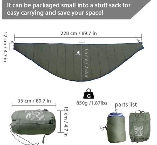 El edredó de hamaca de 3 a 4 temporades és ideal per a temperatures de 41 ° F a 68 ° F; Té una forma perfectament per adaptar -se a penjar una hamaca, que us protegeix del vent i us manté cola.
